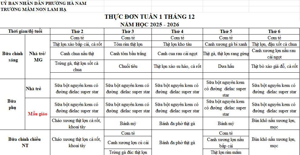 THỰC ĐƠN TRƯỜNG MẦM NON LAM HẠ TUẦN 1 THÁNG 12/2025