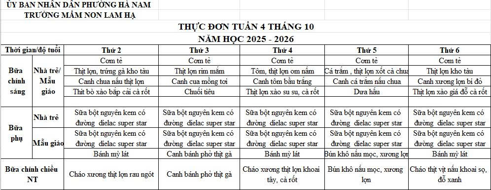 THỰC ĐƠN TRƯỜNG MẦM NON LAM HẠ TUẦN 4 THÁNG 10/2025